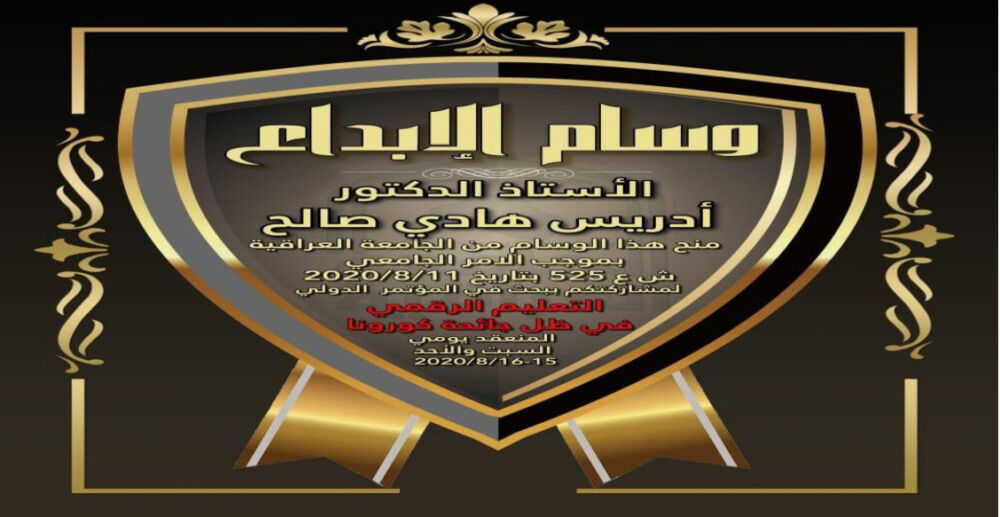 Tishk International University honored two creativity medals from the International conference titled (Digital Education during the Corona Pandemic) on August,11, 2020.The researchers, Professor. Dr. Idris Hadi Salih, President of Tishk International University and Professor Dr. Qaysar Salih Mahdy, Director of the E-Learning Center at Tishk International University and Director of the IT Services Department, were honored with two Creativity Medals from AL-Iraqia University on August,11,2020 for their publication and participation in a scientific research under the title (Evaluation of Robot Professor Technology in Teaching and Business), This international conference was held on July,25-26, 2020 , and titled on